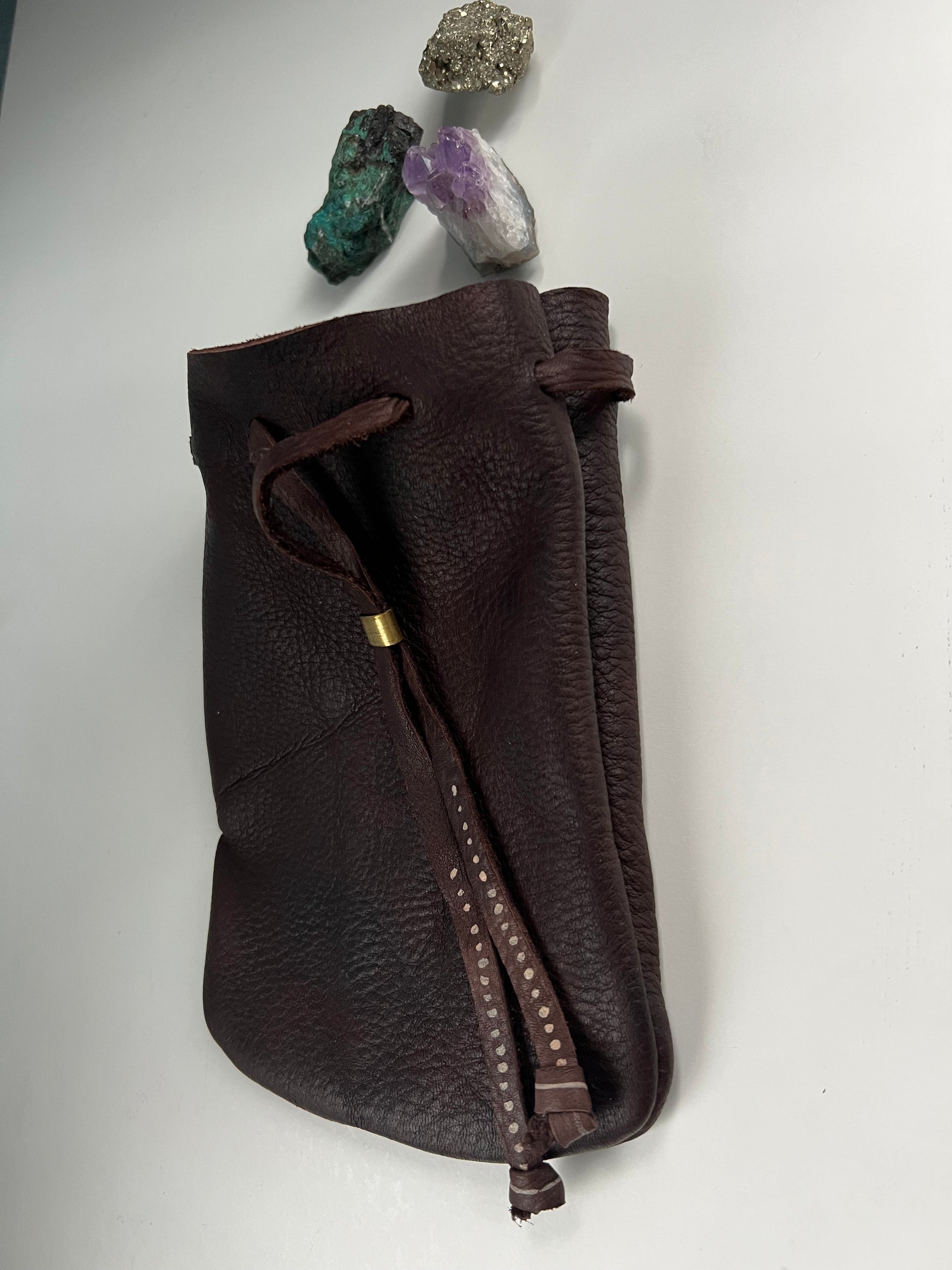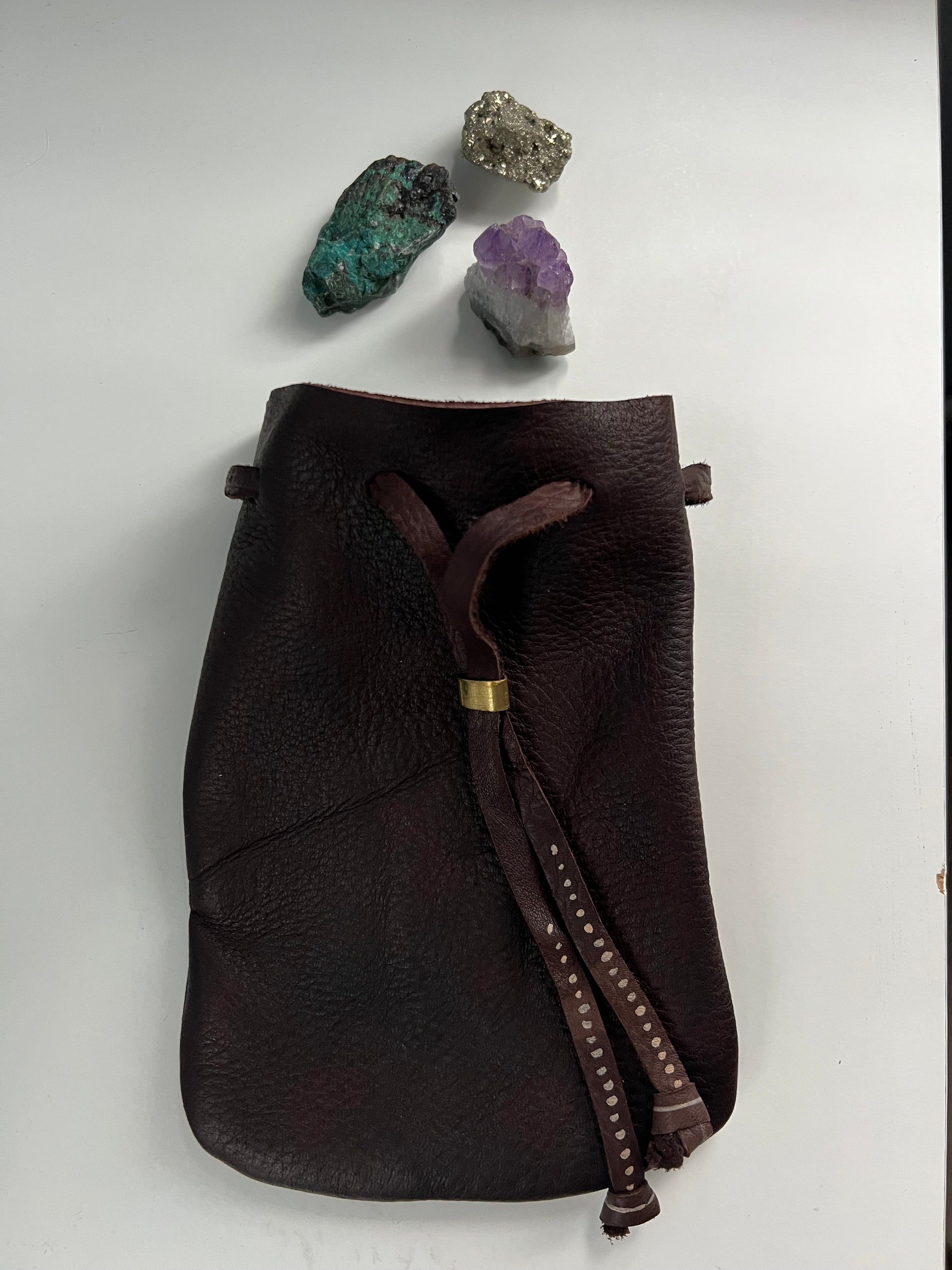 Made of Oregon Elkskin, this bag is buttery soft, and sized for holding rocks, crystals, or other treasures. Draws closed with a hand cut tie and brass pull to keep your collection secure. Made with love, in Portland, Oregon, from locally sourced elkskin, which is prized for its flexibility and durability.