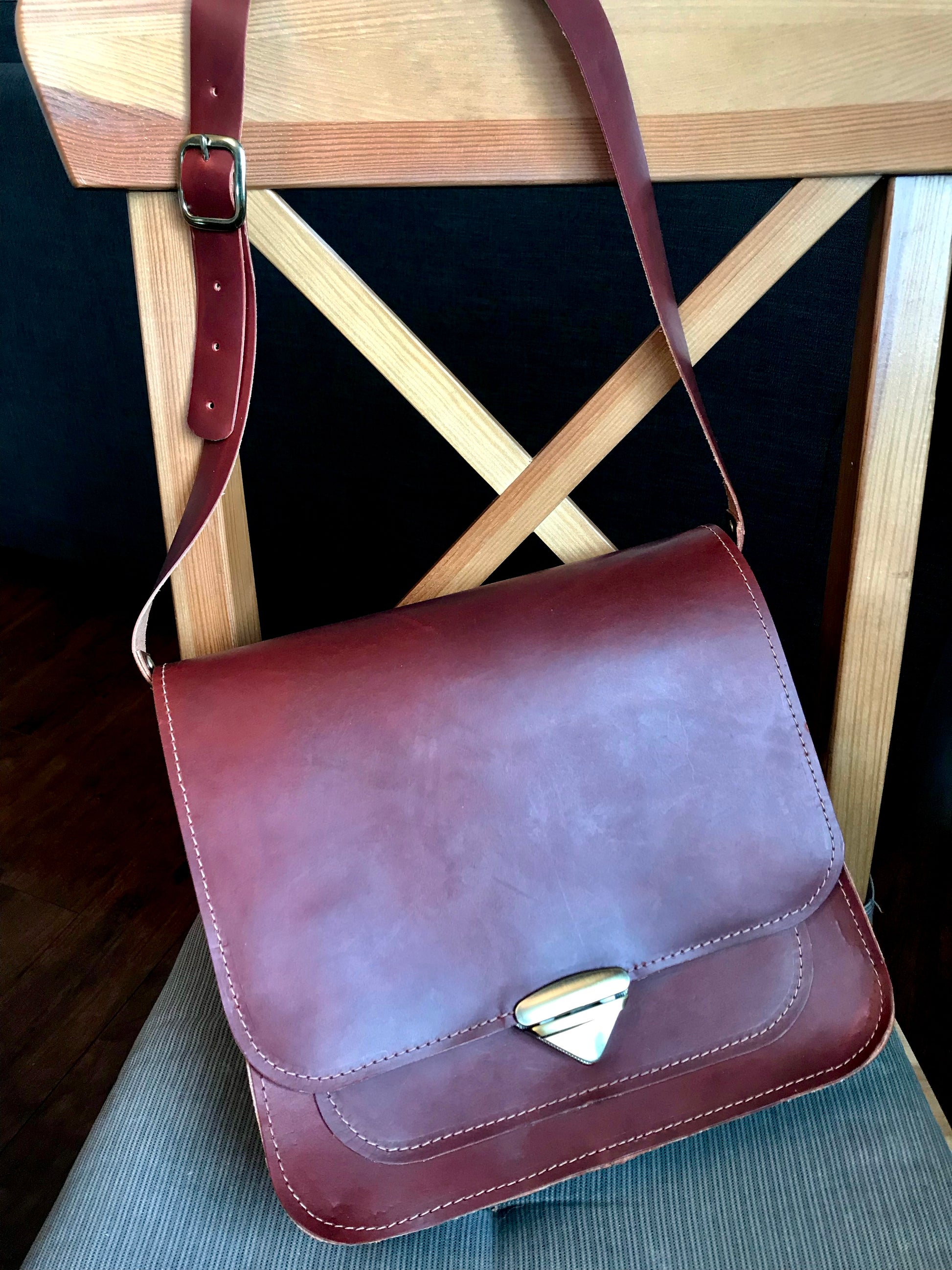 This classic bag has been handcrafted from full grain American leather. It has a lovely sheen, and is made to love and use for years. The oiled leather is durable, water resistant, and wears beautifully, gaining patina with use. Front pocket and adjustable strap.